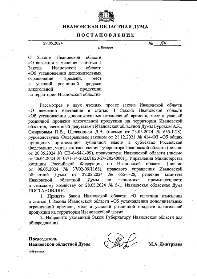 Постановление Ивановской областной Думы от 29.05.2024 N 94 "О Законе Ивановской области "О внесении изменения в статью 1 Закона Ивановской области "Об установлении дополнительных ограничений времени, мест и условий розничной продажи алкогольной продукции на территории Ивановской области"
