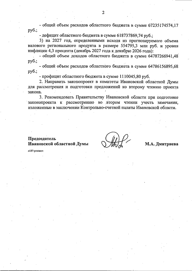 Постановление Ивановской областной Думы от 14.11.2024 N 181 "О проекте закона Ивановской области "Об областном бюджете на 2025 год и на плановый период 2026 и 2027 годов"