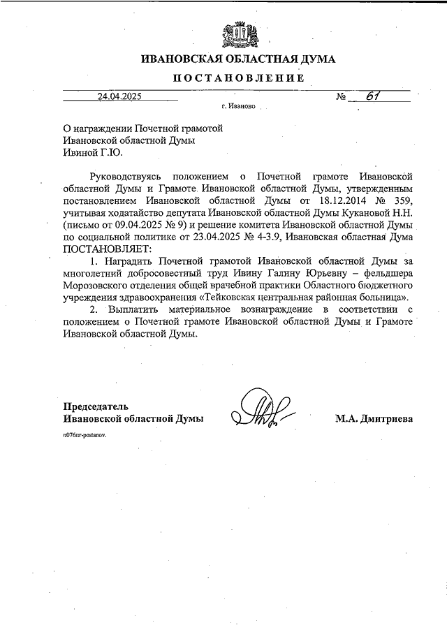 Постановление Ивановской областной Думы от 24.04.2025 N 61 "О награждении Почетной грамотой Ивановской областной Думы Ивиной Г.Ю."