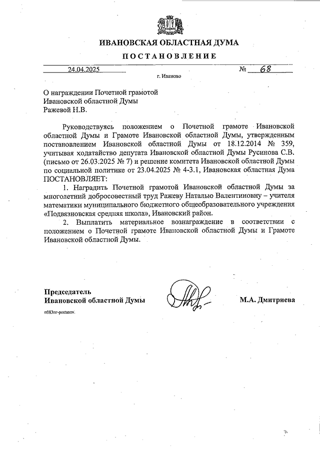 Постановление Ивановской областной Думы от 24.04.2025 N 68 "О награждении Почетной грамотой Ивановской областной Думы Ражевой Н.В."