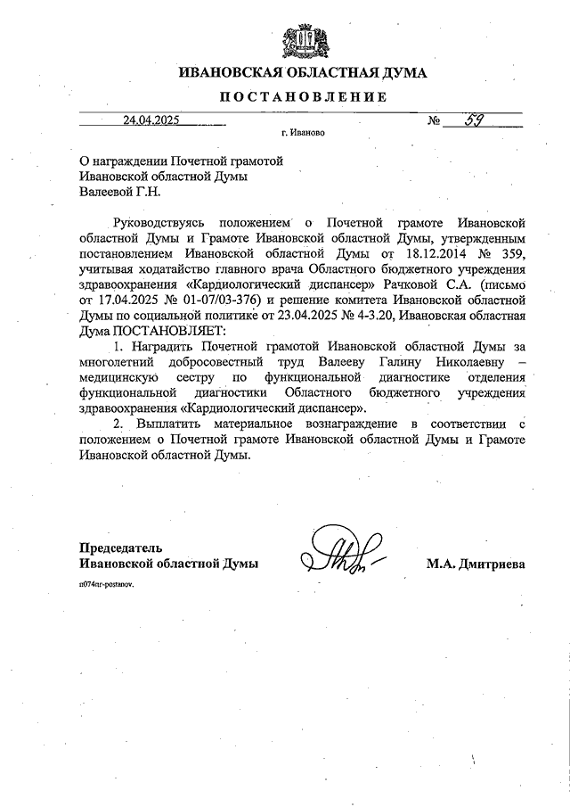 Постановление Ивановской областной Думы от 24.04.2025 N 59 "О награждении Почетной грамотой Ивановской областной Думы Валеевой Г.Н."