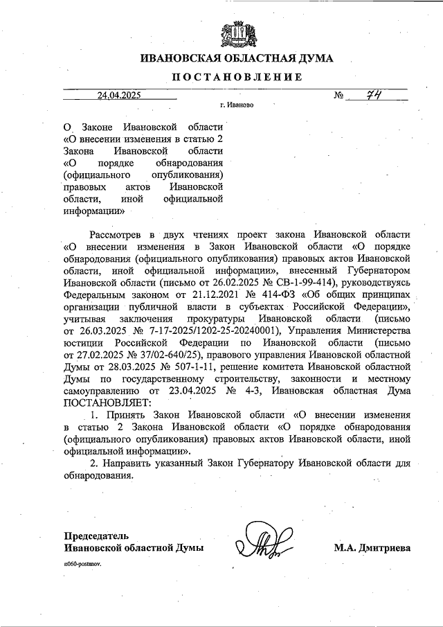 Постановление Ивановской областной Думы от 24.04.2025 N 74 "О Законе Ивановской области "О внесении изменения в статью 2 Закона Ивановской области "О порядке обнародования (официального опубликования) правовых актов Ивановской области, иной официальной информации"