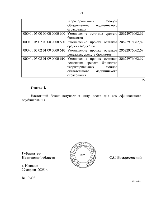 Закон Ивановской области от 29.04.2025 N 17-ОЗ "О внесении изменений в Закон Ивановской области "О бюджете территориального фонда обязательного медицинского страхования Ивановской области на 2025 год и на плановый период 2026 и 2027 годов" (принят Ивановской областной Думой 24.04.2025)