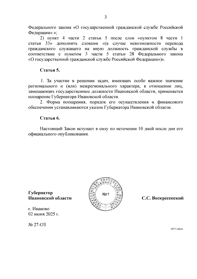 Закон Ивановской области от 02.06.2025 N 27-ОЗ "Об отдельных вопросах, связанных с замещением государственных должностей Ивановской области, и о внесении изменений в некоторые законодательные акты Ивановской области" (принят Ивановской областной Думой 29.05.2025)