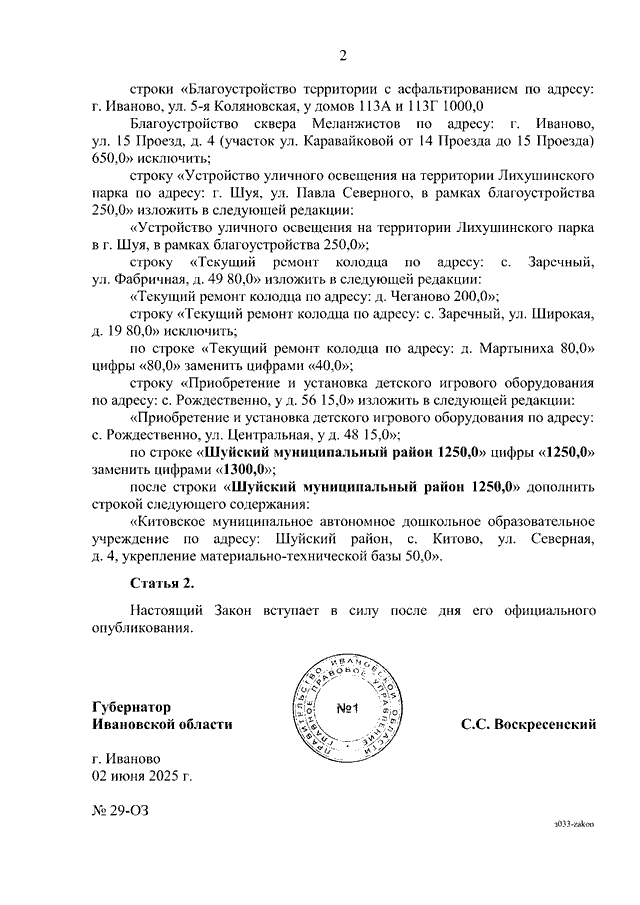 Закон Ивановской области от 02.06.2025 N 29-ОЗ "О внесении изменений в приложение к Закону Ивановской области "Об утверждении перечня наказов избирателей на 2025 год" (принят Ивановской областной Думой 29.05.2025)