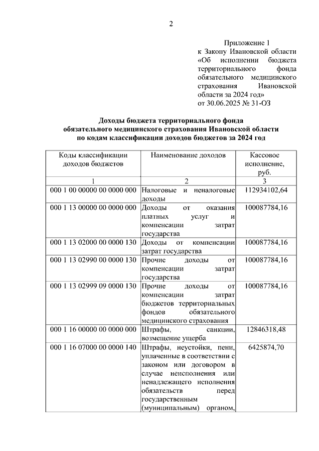 Закон Ивановской области от 30.06.2025 N 31-ОЗ "Об исполнении бюджета территориального фонда обязательного медицинского страхования Ивановской области за 2024 год" (принят Ивановской областной Думой 26.06.2025)