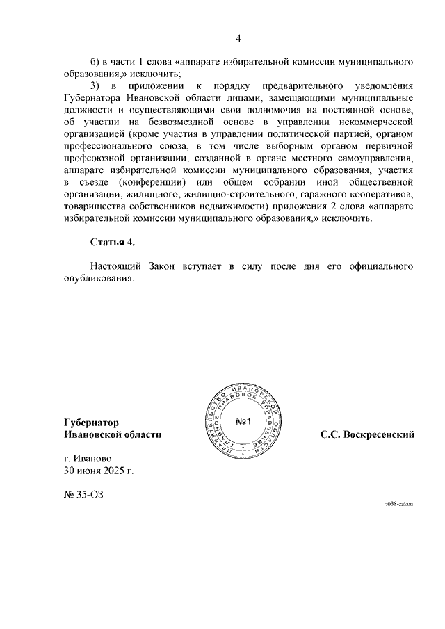 Закон Ивановской области от 30.06.2025 N 35-ОЗ "О внесении изменений в отдельные законодательные акты Ивановской области" (принят Ивановской областной Думой 26.06.2025)