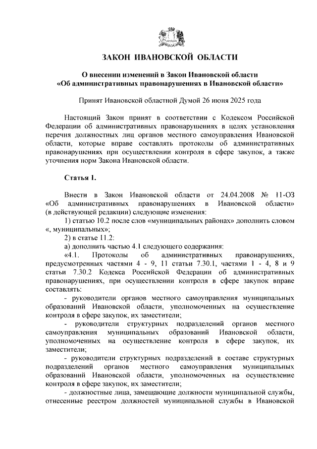 Закон Ивановской области от 30.06.2025 N 36-ОЗ "О внесении изменений в Закон Ивановской области "Об административных правонарушениях в Ивановской области" (принят Ивановской областной Думой 26.06.2025)