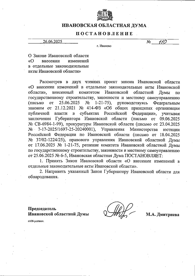 Постановление Ивановской областной Думы от 26.06.2025 N 110 "О Законе Ивановской области "О внесении изменений в отдельные законодательные акты Ивановской области"