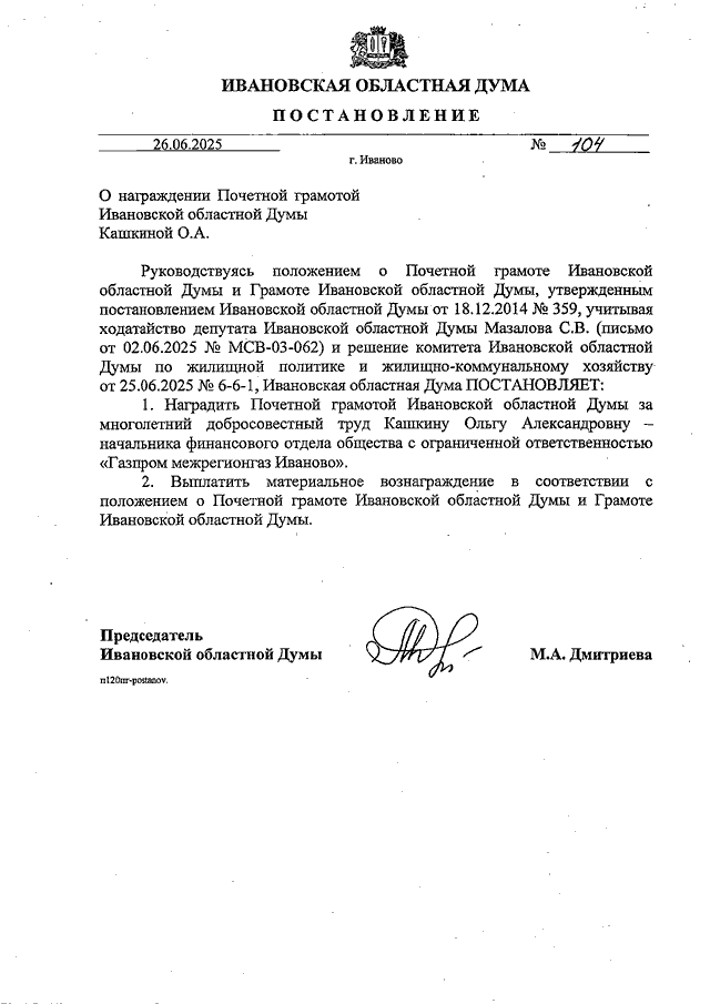 Постановление Ивановской областной Думы от 26.06.2025 N 104 "О награждении Почетной грамотой Ивановской областной Думы Кашкиной О.А."