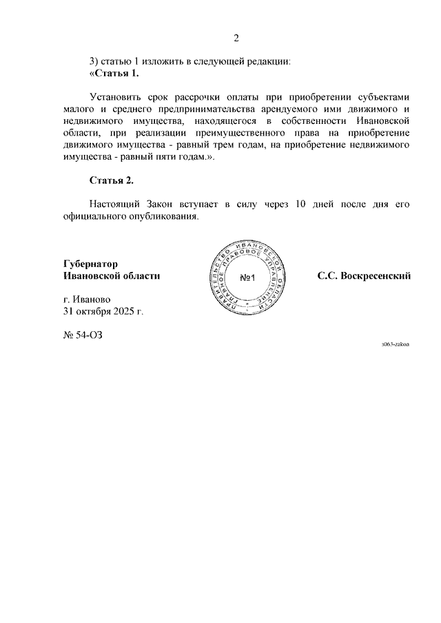 Закон Ивановской области от 31.10.2025 N 54-ОЗ "О внесении изменений в Закон Ивановской области "Об установлении срока рассрочки оплаты при приобретении субъектами малого и среднего предпринимательства арендуемого ими недвижимого имущества, находящегося в собственности Ивановской области, при реализации преимущественного права на приобретение такого имущества" (принят Ивановской областной Думой 23.10.2025)