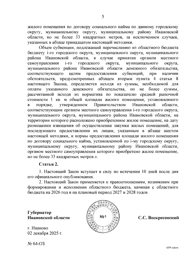 Закон Ивановской области от 02.12.2025 N 64-ОЗ "О внесении изменений в Закон Ивановской области "О дополнительных гарантиях по социальной поддержке детей-сирот и детей, оставшихся без попечения родителей, в Ивановской области" (принят Ивановской областной Думой 27.11.2025)