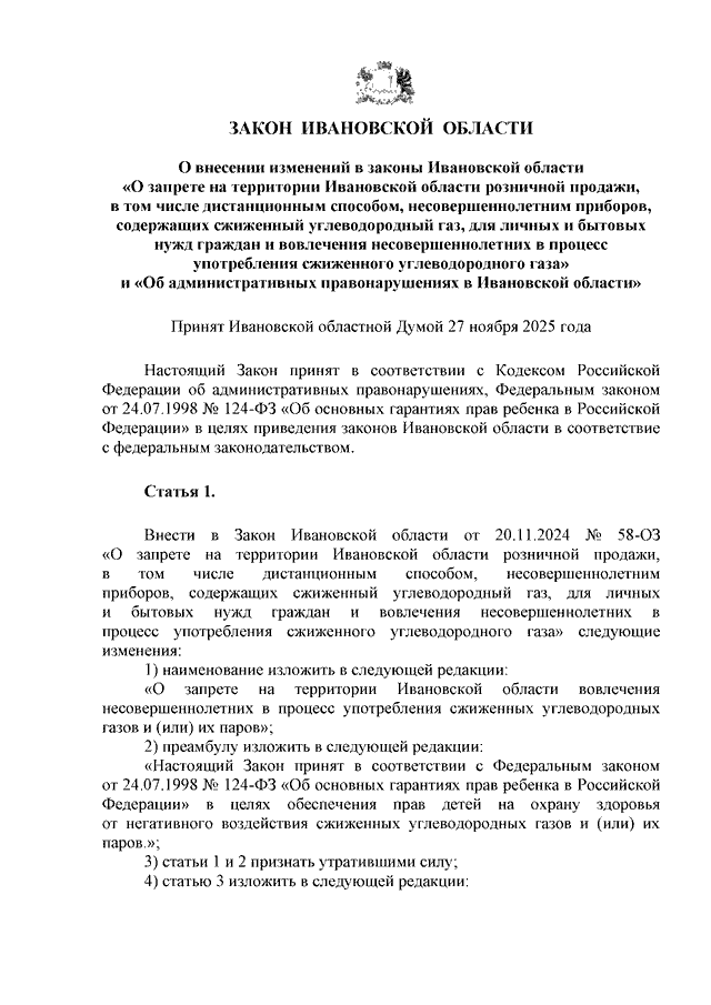 Закон Ивановской области от 02.12.2025 N 70-ОЗ "О внесении изменений в законы Ивановской области "О запрете на территории Ивановской области розничной продажи, в том числе дистанционным способом, несовершеннолетним приборов, содержащих сжиженный углеводородный газ, для личных и бытовых нужд граждан и вовлечения несовершеннолетних в процесс употребления сжиженного углеводородного газа" и "Об административных правонарушениях в Ивановской области" (принят Ивановской областной Думой 27.11.2025)
