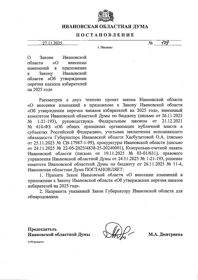 Постановление Ивановской областной Думы от 27.11.2025 N 179 "О Законе Ивановской области "О внесении изменений в приложение к Закону Ивановской области "Об утверждении перечня наказов избирателей на 2025 год"