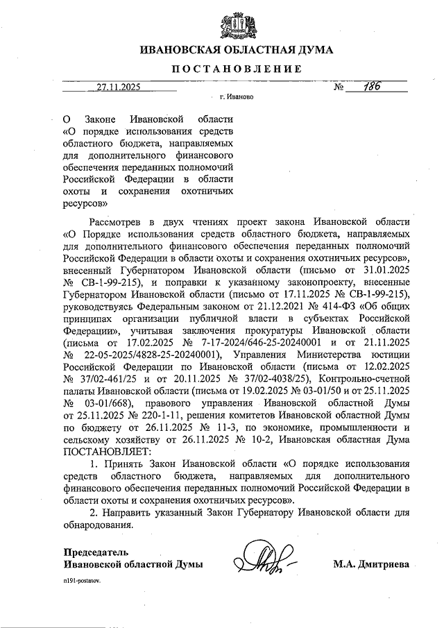 Постановление Ивановской областной Думы от 27.11.2025 N 186 "О Законе Ивановской области "О порядке использования средств областного бюджета, направляемых для дополнительного финансового обеспечения переданных полномочий Российской Федерации в области охоты и сохранения охотничьих ресурсов"