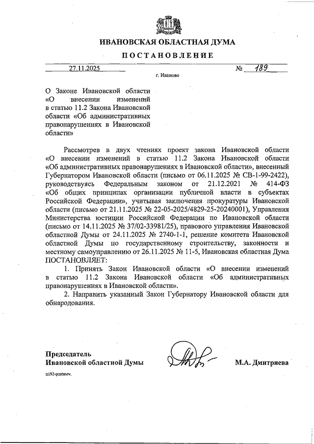 Постановление Ивановской областной Думы от 27.11.2025 N 189 "О Законе Ивановской области "О внесении изменений в статью 11.2 Закона Ивановской области "Об административных правонарушениях в Ивановской области"