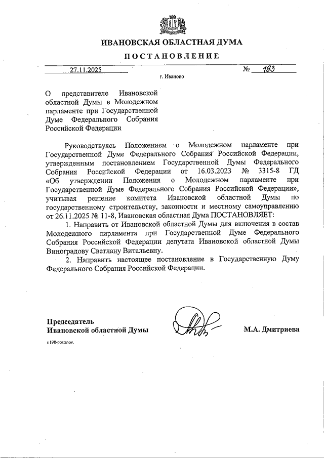 Постановление Ивановской областной Думы от 27.11.2025 N 193 "О представителе Ивановской областной Думы в Молодежном парламенте при Государственной Думе Федерального Собрания Российской Федерации"