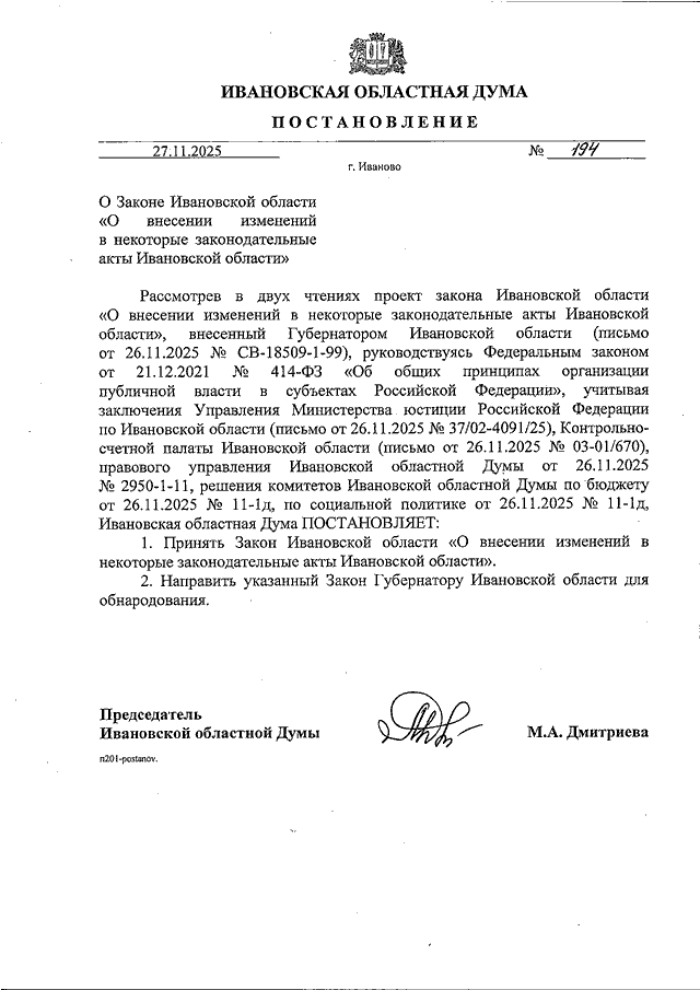 Постановление Ивановской областной Думы от 27.11.2025 N 194 "О Законе Ивановской области "О внесении изменений в некоторые законодательные акты Ивановской области"