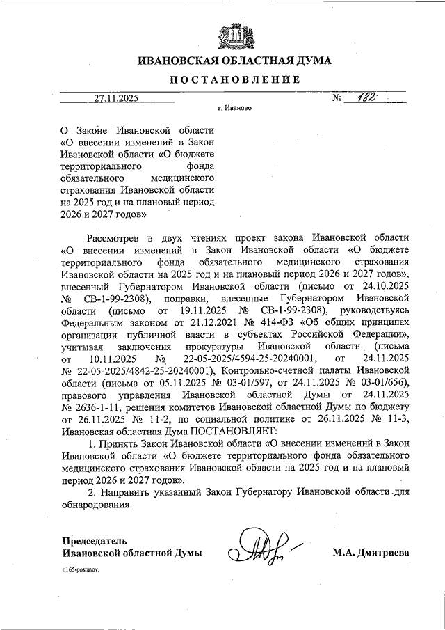 Постановление Ивановской областной Думы от 27.11.2025 N 182 "О Законе Ивановской области "О внесении изменений в Закон Ивановской области "О бюджете территориального фонда обязательного медицинского страхования Ивановской области на 2025 год и на плановый период 2026 и 2027 годов"