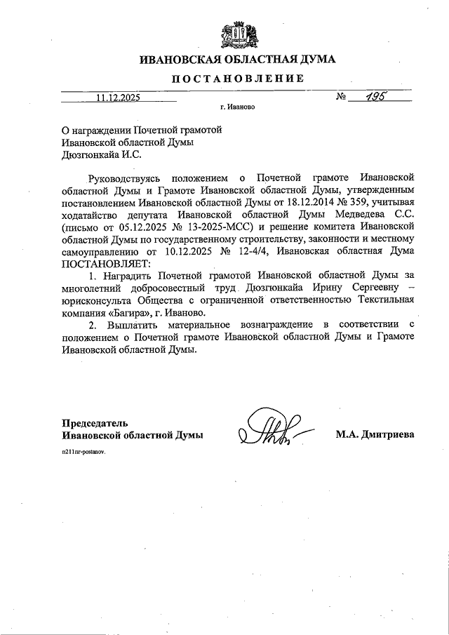 Постановление Ивановской областной Думы от 11.12.2025 N 195 "О награждении Почетной грамотой Ивановской областной Думы Дюзгюнкайа И.С."