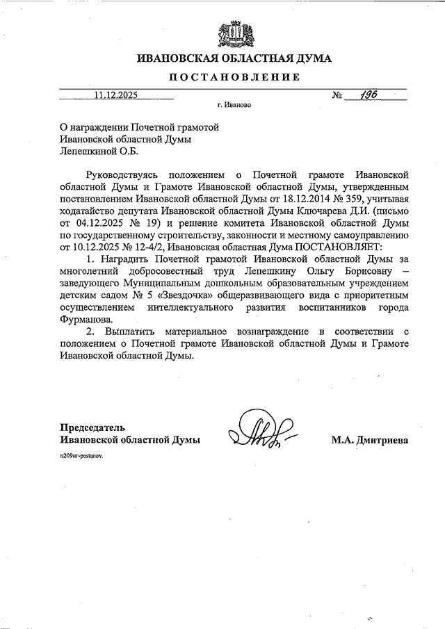 Постановление Ивановской областной Думы от 11.12.2025 N 196 "О награждении Почетной грамотой Ивановской областной Думы Лепешкиной О.Б."