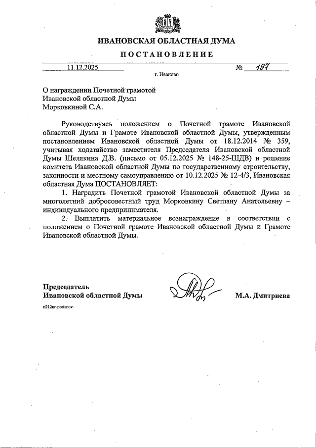 Постановление Ивановской областной Думы от 11.12.2025 N 197 "О награждении Почетной грамотой Ивановской областной Думы Морковкиной С.А."