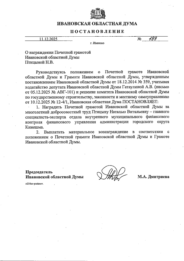 Постановление Ивановской областной Думы от 11.12.2025 N 199 "О награждении Почетной грамотой Ивановской областной Думы Птицыной Н.В."