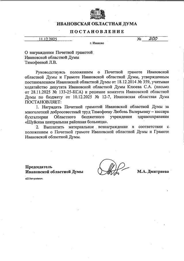 Постановление Ивановской областной Думы от 11.12.2025 N 200 "О награждении Почетной грамотой Ивановской областной Думы Тимофеевой Л.В."