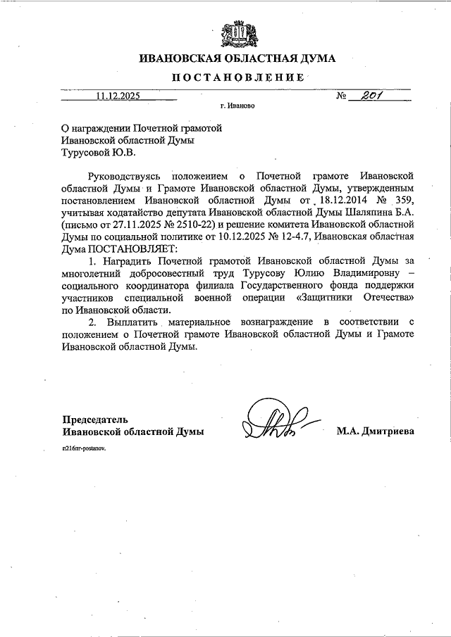 Постановление Ивановской областной Думы от 11.12.2025 N 201 "О награждении Почетной грамотой Ивановской областной Думы Турусовой Ю.В."