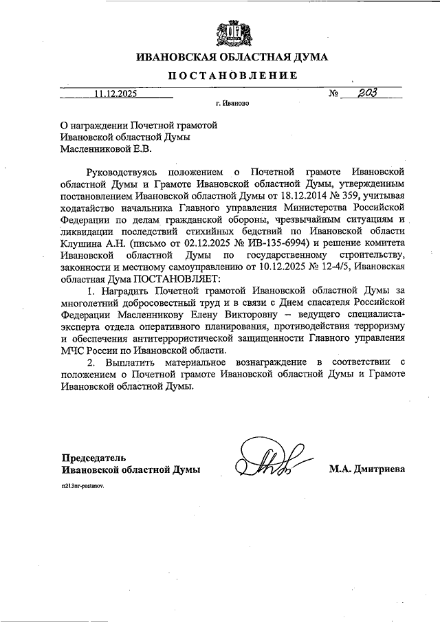 Постановление Ивановской областной Думы от 11.12.2025 N 203 "О награждении Почетной грамотой Ивановской областной Думы Масленниковой Е.В."