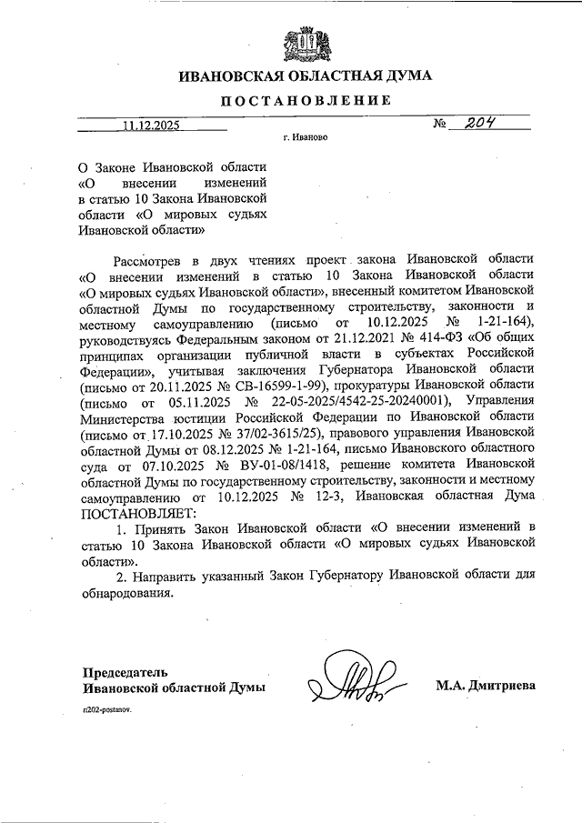 Постановление Ивановской областной Думы от 11.12.2025 N 204 "О Законе Ивановской области "О внесении изменений в статью 10 Закона Ивановской области "О мировых судьях Ивановской области"