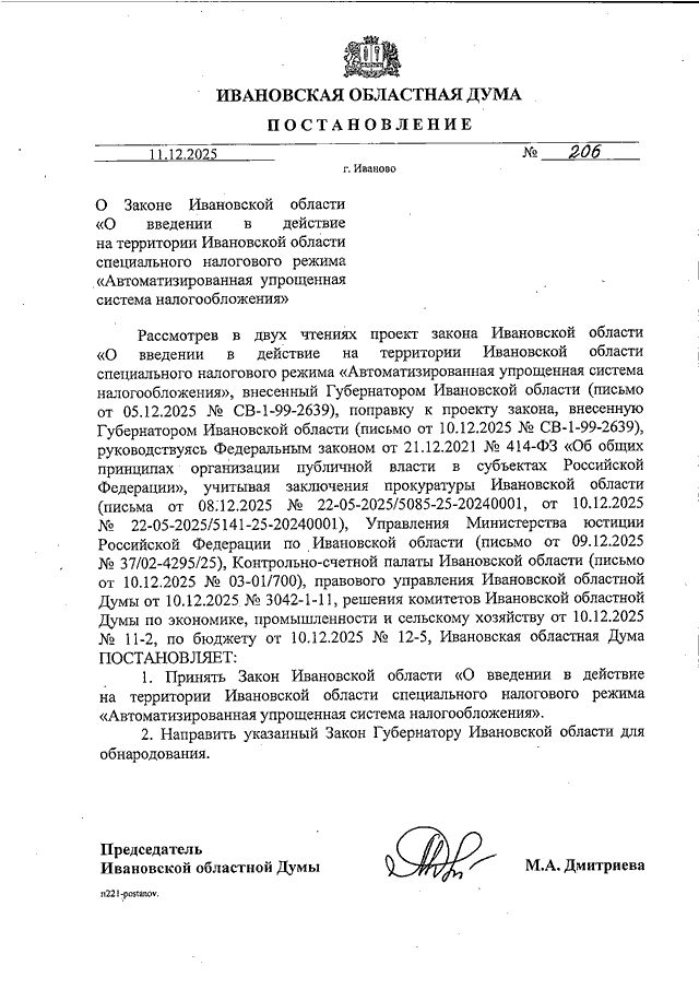 Постановление Ивановской областной Думы от 11.12.2025 N 206 "О Законе Ивановской области "О введении в действие на территории Ивановской области специального налогового режима "Автоматизированная упрощенная система налогообложения"