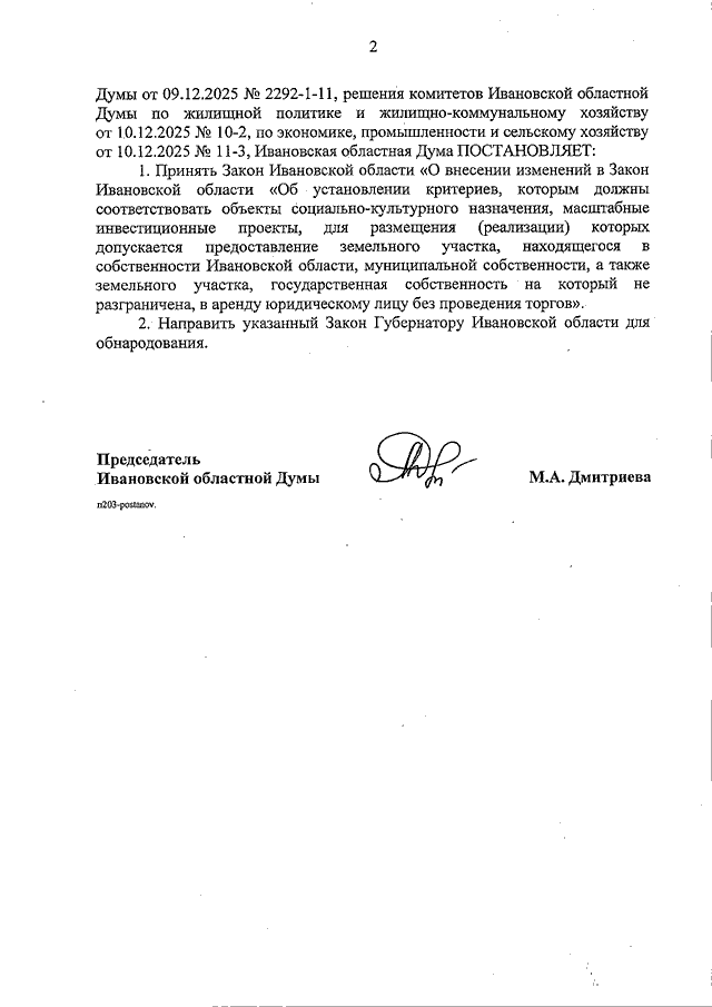 Постановление Ивановской областной Думы от 11.12.2025 N 208 "О Законе Ивановской области "О внесении изменений в Закон Ивановской области "Об установлении критериев, которым должны соответствовать объекты социально-культурного назначения, масштабные инвестиционные проекты, для размещения (реализации) которых допускается предоставление земельного участка, находящегося в собственности Ивановской области, муниципальной собственности, а также земельного участка, государственная собственность на который не разграничена, в аренду юридическому лицу без проведения торгов"