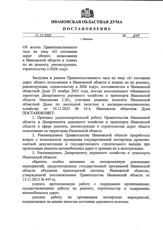 Постановление Ивановской областной Думы от 11.12.2025 N 211 "Об итогах Правительственного часа на тему "О состоянии дорог общего пользования в Ивановской области и планах по их ремонту, реконструкции, строительству в 2026 году"