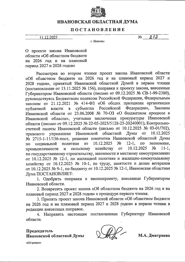 Постановление Ивановской областной Думы от 11.12.2025 N 212 "О проекте закона Ивановской области "Об областном бюджете на 2026 год и на плановый период 2027 и 2028 годов"