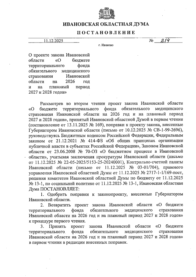 Постановление Ивановской областной Думы от 11.12.2025 N 214 "О проекте закона Ивановской области "О бюджете территориального фонда обязательного медицинского страхования Ивановской области на 2026 год и на плановый период 2027 и 2028 годов"