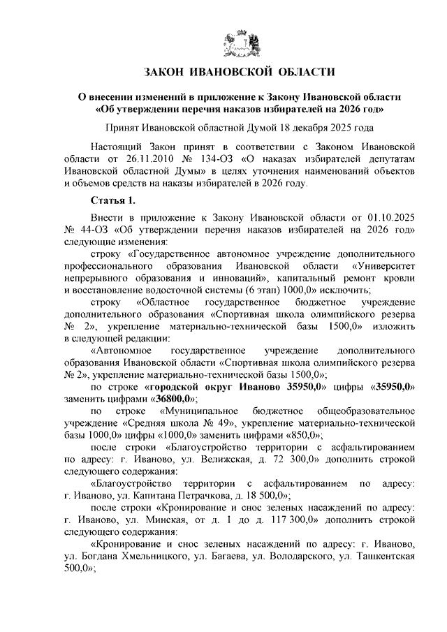 Закон Ивановской области от 19.12.2025 N 87-ОЗ "О внесении изменений в приложение к Закону Ивановской области "Об утверждении перечня наказов избирателей на 2026 год" (принят Ивановской областной Думой 18.12.2025)