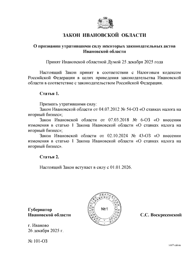 Закон Ивановской области от 26.12.2025 N 101-ОЗ "О признании утратившими силу некоторых законодательных актов Ивановской области" (принят Ивановской областной Думой 25.12.2025)