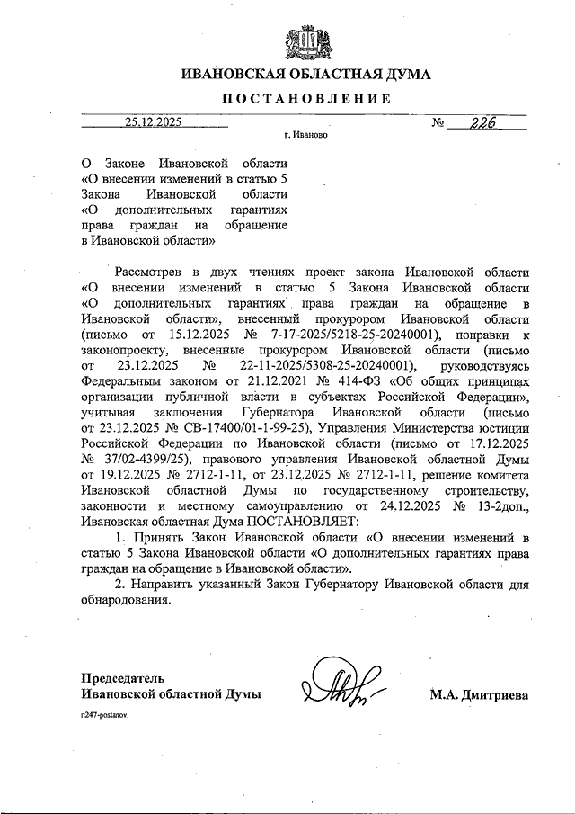 Постановление Ивановской областной Думы от 25.12.2025 N 226 "О Законе Ивановской области "О внесении изменений в статью 5 Закона Ивановской области "О дополнительных гарантиях права граждан на обращение в Ивановской области"