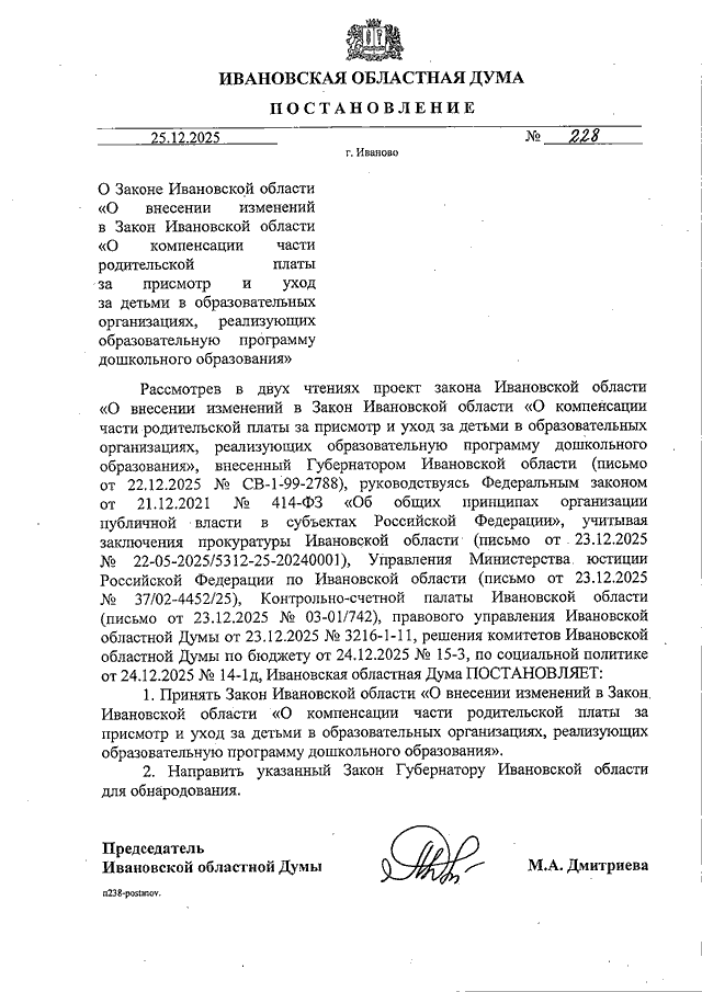 Постановление Ивановской областной Думы от 25.12.2025 N 228 "О Законе Ивановской области "О внесении изменений в Закон Ивановской области "О компенсации части родительской платы за присмотр и уход за детьми в образовательных организациях, реализующих образовательную программу дошкольного образования"