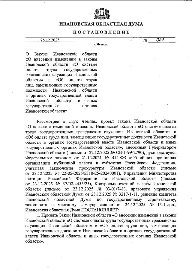 Постановление Ивановской областной Думы от 25.12.2025 N 231 "О Законе Ивановской области "О внесении изменений в законы Ивановской области "О системе оплаты труда государственных гражданских служащих Ивановской области" и "Об оплате труда лиц, замещающих государственные должности Ивановской области в органах государственной власти Ивановской области и иных государственных органах Ивановской области"