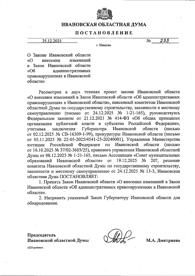 Постановление Ивановской областной Думы от 25.12.2025 N 233 "О Законе Ивановской области "О внесении изменений в Закон Ивановской области "Об административных правонарушениях в Ивановской области"