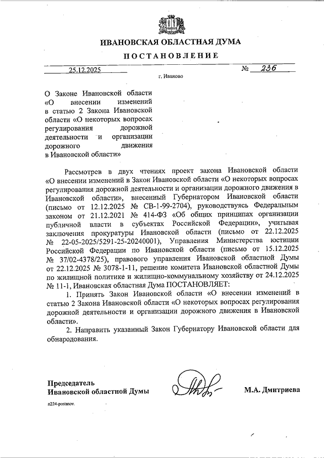 Постановление Ивановской областной Думы от 25.12.2025 N 236 "О Законе Ивановской области "О внесении изменений в статью 2 Закона Ивановской области "О некоторых вопросах регулирования дорожной деятельности и организации дорожного движения в Ивановской области"