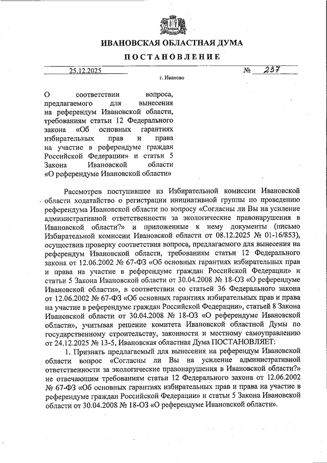 Постановление Ивановской областной Думы от 25.12.2025 N 237 "О соответствии вопроса, предлагаемого для вынесения на референдум Ивановской области, требованиям статьи 12 Федерального закона "Об основных гарантиях избирательных прав и права на участие в референдуме граждан Российской Федерации" и статьи 5 Закона Ивановской области "О референдуме Ивановской области"