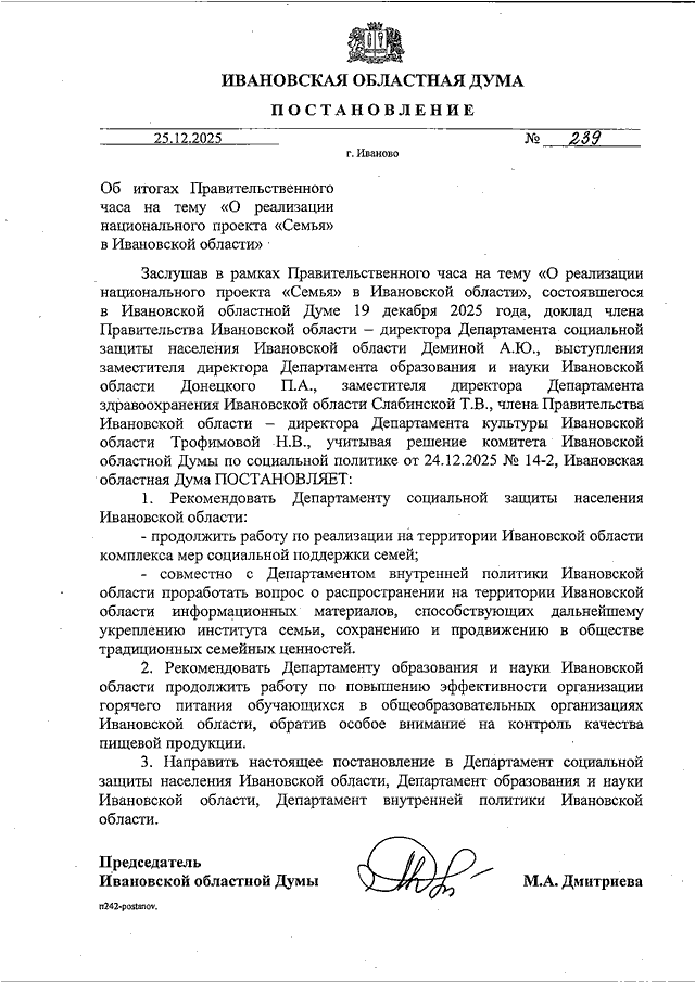 Постановление Ивановской областной Думы от 25.12.2025 N 239 "Об итогах Правительственного часа на тему "О реализации национального проекта "Семья" в Ивановской области"